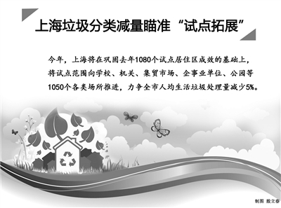 今年上海垃圾分类减量的工作目标主要是“试点拓展”,即在巩固2011年1080个试点居住区成效的基础上,将试点范围向学校、机关、集贸市场、企事业单位、公园等1050个各类场所推进,全市人均生活垃圾处理量减少5%。