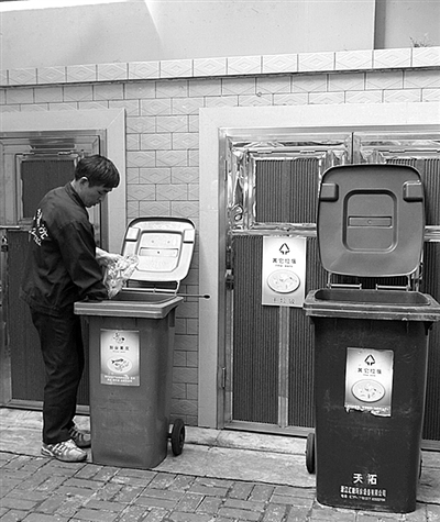 牛奶盒、报纸、废金属等要扔进靠墙挨个排着的3个垃圾桶的第一个——蓝色“可回收物”桶,垃圾房灰色门板就是用回收来的牛奶盒再造的,红色“有害垃圾”桶和绿色“玻璃”桶上都标明哪些东西可以扔进去。另一面墙边上那个是“废旧衣物”回收箱,扔进去的衣物只有回收企业才能取出,他们会对每件衣物分别处置。