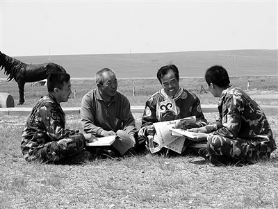 今年以来,内蒙古包头市公安边防支队的25名一线驻村民警,组织农牧民开展一些文化活动,丰富他们的业余生活。图为民警正在与牧民一起读书看报交流。白生云摄