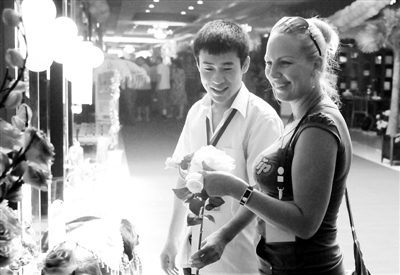 7月18日,一名俄罗斯采购商在一家饰品店前挑选家居饰品。