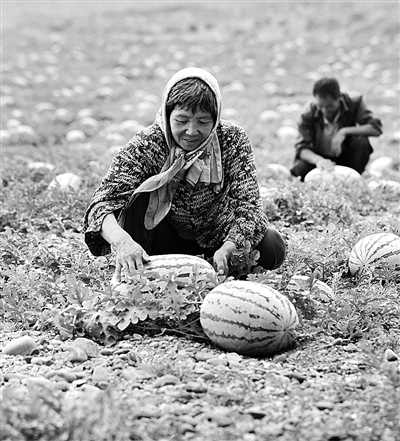 宁夏回族自治区中宁县万亩硒砂瓜进入全面采摘期,预计产量可达31万吨,实现产值近4.65亿元。图为中宁县鸣沙镇五道渠村农户在采摘成熟的硒砂瓜。