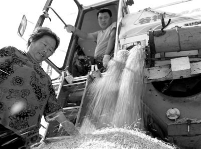 这是山东青岛即墨市刘家庄镇麦农卸下收获的小麦(2012年6月19日摄)。国家统计局山东调查总队7月25日公布的数据显示,今年山东夏粮丰收,小麦总产218亿公斤,单产创历史新高。 梁孝鹏摄(新华社发)