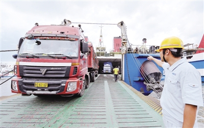 7月25日,海口港的工作人员指挥货车下船。当日,随着天气状况好转,琼州海峡全面复航,海南省所有出岛列车、省际班车等恢复正常发班。此前,受台风“韦森特”影响,海口海事局决定自22日18时起,琼州海峡客滚船全线停航。 新华社记者 郭 程摄