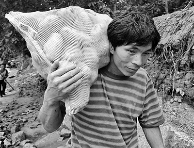7月25日,河北省涞源县雁宿崖村村民将政府发放的蔬菜运回村。 新华社记者 杨世尧摄