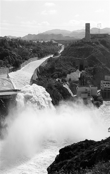 7月25日,刘家峡水电站溢洪道防洪泄水。当日,刘家峡水库水位1724.15米,下泄流量每秒达1600立方米。 史有东摄(新华社发)