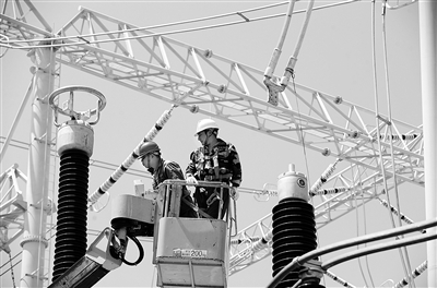 由湖北省送变电工程公司施工的江夏500千伏变电站于2011年4月正式开工,将于今年8月送电投运。为了确保按时投产运营,电力工人们冒着高温工作。 新华社记者 郝同前摄