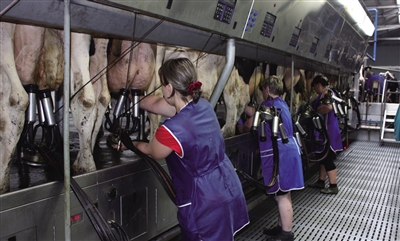 采访时,正值奶牛挤奶时间,鼓胀着乳房的奶牛,有序地走进现代化的挤奶房,在一台台挤奶机前站好,3位年轻的养殖场女工麻利地将电子吸奶头嘬住清洁好的奶牛乳头,即刻有奶液喷溅入吸奶盒中,再顺着管子集中流入硕大的储奶罐内。鲜奶经过滤后进行冷藏,再运往其他加工企业。