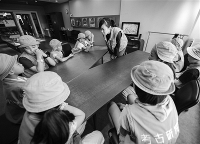 今年21岁的萧子芸,是台湾政治大学教育系的大二学生。这个暑假,她和另外18名台湾大学生一起在杭州市青少年活动中心的模拟职业迷你城市“Do都城”实习,担任带队老师的角色,成为一个名副其实的“孩子王”。图为萧子芸在Do都城“考古研究院”向前来体验的小朋友提问。 新华社发