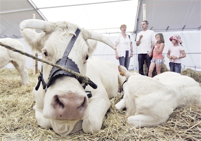 7月27日,在比利时东南部小城利布拉蒙,一家人在农业博览会的牛棚中参观。当天,第78届利布拉蒙农业博览会开幕。该博览会是欧洲重要的农业展会,集中展示各种优良家畜品种及农业机械等。 新华社发