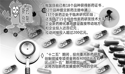 来自科技部的资料显示,通过国家科技重大专项、“863”等科技计划的立项支持,目前我国已有18个品种获得新药证书,22个品种提交新药注册申请,137个新药正处于临床研究阶段。同时,药物大品种改造进展顺利,选择支持了36个药物大品种的技术改造;还支持了15个综合性新药研发技术大平台,在新药品种研发、候选药物筛选等新药研发能力建设方面呈现良好势头;企业新药孵化基地建设直接带动了地方和企业投入近百亿元,拉动间接投入超过200亿元。“十二五”期间,投向重大新药研发、创制领域专项资金将在400亿元左右,比“十一五”期间增加一倍,这将为创新药发展提供广阔的空间。
