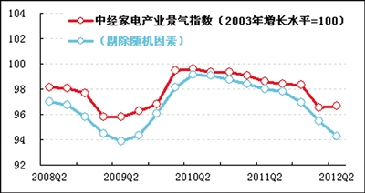 进一步剔除随机因素后,中经家电产业景气指数为94.3,较上季度继续回落1.2点(见中经家电产业景气走势图中的蓝色曲线),说明家电产业自身增长动力仍然不足,而5月中旬节能家电补贴政策的出台有望使家电产业景气度出现企稳并回升。
