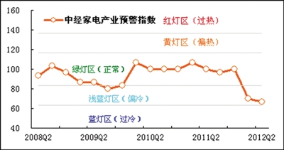 二季度,中经家电产业预警指数为66.7点,较上季度继续下降3.3点,连续2个季度运行于偏冷的“浅蓝灯”区,目前该指数已为历史新低。