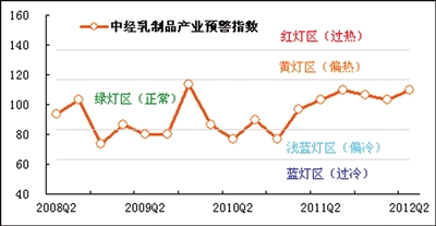 二季度,中经乳制品产业预警指数为110.0点,比一季度上升6.7点,已在“绿灯区”上部靠近“黄灯区”的方位运行。