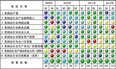 在构成中经乳制品产业预警指数的10个指标(仅剔除季节因素,保留随机因素)中,位于“红灯区”的有1个指标,即乳制品行业税金总额;位于“黄灯区”的有3个指标,即乳制品行业利润总额、固定资产投资和生产者出厂价格指数;位于“绿灯区”的有4个指标,即乳制品行业从业人员、出口交货值、产成品资金占用(逆转)和应收账款(逆转);位于“浅蓝灯区”的有2个指标,即乳制品产量和乳制品行业产品销售收入。