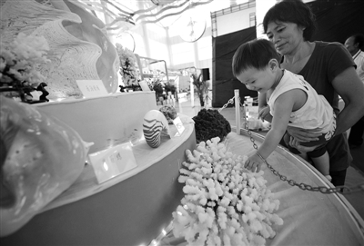 7月27日,一名小朋友好奇的触摸珊瑚标本。近日,2012中国(海南)国际海洋产业博览会在海口市会展中心举行,展示水产品、水产品加工技术及设备、渔药饲料及水产苗种、渔业捕捞技术和装备等,共有200多家国内外海洋产业企业参展。 新华社记者 郭 程摄