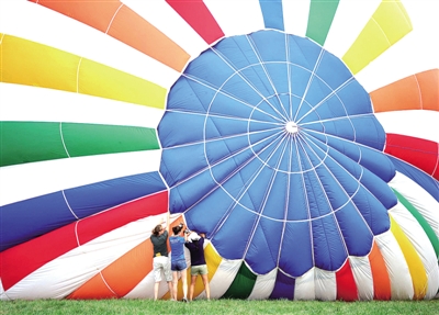 7月29日,在美国新泽西州南部城市雷丁顿,几名热气球爱好者在为热气球进行升空操作。