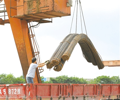 7月29日,大型机械在杭州市某钢材市场吊装钢材。据国内知名钢铁资讯机构“我的钢铁”提供的最新市场报告,国内钢价出现了近8个月以来最大的周跌幅。市场内的人士反映,钢价已连续数周下跌,最近沙钢等代表性钢厂又下调了最新的出厂定价,钢坯价格也在大幅回落。