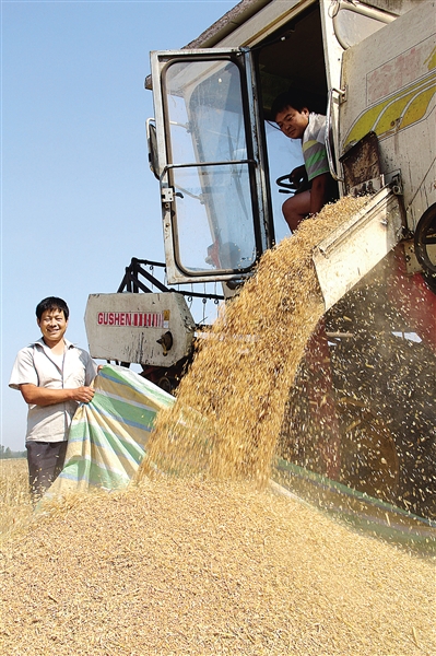 6月11日,河南省内黄县城关镇南长固村农民苏刚志利用收割机收小麦。5年前,苏刚志流转承包土地50多亩,近年来陆续购买了播种机、拖拉机、收割机等农机具,播种、管理、收割实行机械化。“现在通过机械化操作,我一个人管理50亩地比较轻松。”他说。