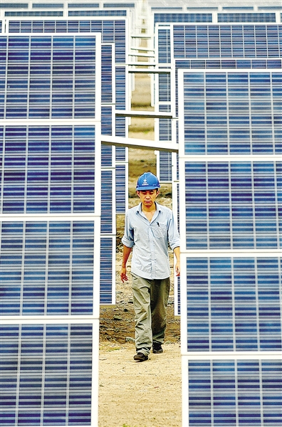 7月22日,在甘肃省张掖市甘州区南滩光电产业园内,一名工作人员从光伏发电设备旁走过。近几年来,甘肃省结合荒漠地区特有的气候特点和自然优势,大力发展风电、光伏发电、太阳能、生物质发电等新型能源产业,打造千万千瓦级风电基地和10兆瓦光伏发电基地,有力支撑全省社会经济的发展。