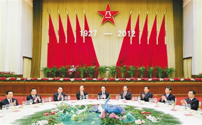 人民大会堂灯火辉煌,花团锦簇,充满了节日气氛。巨型“八一”军徽悬挂在主席台帷幕中央,两旁是10面鲜艳的红旗,“1927-2012”几个醒目的大字,昭示着中国人民解放军走过了85周年光辉的历程。17时55分,在欢快的《迎宾曲》声中,胡锦涛等党和国家领导人步入宴会大厅,同1800余名中外来宾欢聚一堂。