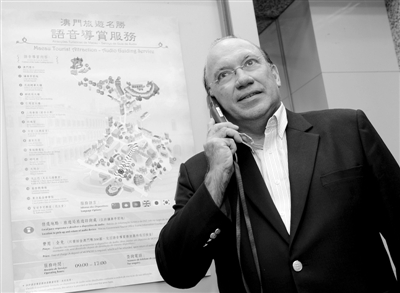 澳门特区政府旅游局推出澳门旅游名胜语音导赏服务。服务器将通过普通话、广东话、葡萄牙语、英语、日语和韩语等6种语言,向旅客提供澳门简介和15个代表景点的语音导赏服务。在缴纳一定押金之后,旅客可以免费借用导赏服务器3天。图为澳门特区政府旅游局局长安栋梁在发布仪式上演示使用语音导赏服务器。 新华社发
