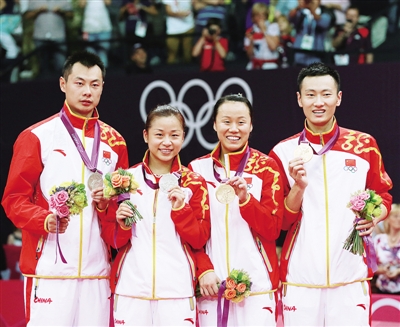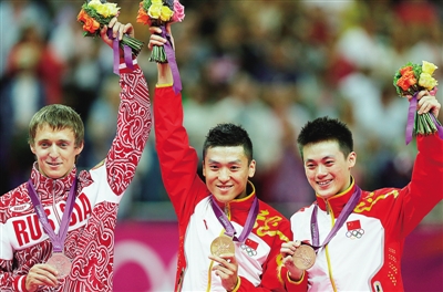 上图 8月3日,中国选手董栋(中)、俄罗斯选手乌沙科夫(左)和中国选手陆春龙在颁奖仪式上合影。当日,在伦敦奥运会男子蹦床决赛中,董栋以62.990分的总成绩夺得冠军,乌沙科夫和陆春龙分获亚军和季军。
