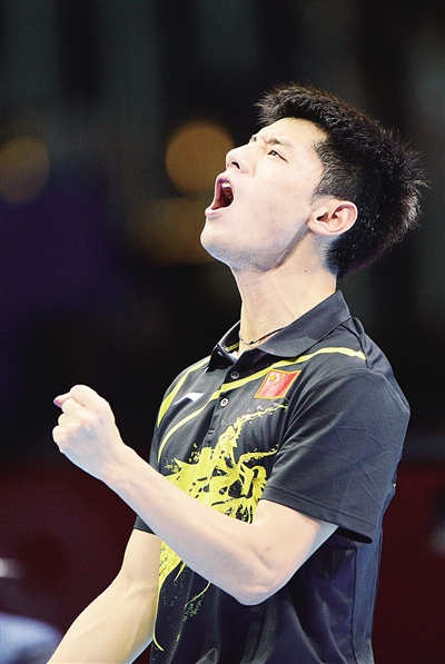 右图 8月2日,张继科在获胜后庆祝。当日,在伦敦奥运会乒乓球男子单打决赛中,中国选手张继科以4比1战胜队友王皓,获得冠军。