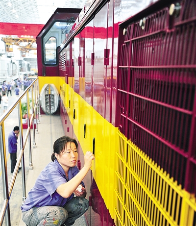 7月27日,一名工人擦拭出口爱沙尼亚的调车机车。当日,一辆紫红色的“火车头”——调车机车从中国北京长辛店的中国北车二七装备公司驶出。这一机车将从天津装船出海,抵达北欧波罗的海沿岸的爱沙尼亚。这是“中国造”世界最高端铁路机车的首次欧盟之旅。