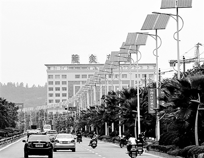 新余市城北新欣北大道上安装的太阳能路灯(8月5日摄)。近年来,江西新余市在加快建筑领域光电及光热应用的同时,要求新建小区利用太阳能光伏照明技术设置路灯、草坪灯等,并逐步对既有的公共场所及开阔地道路进行太阳能光伏照明技术改造。