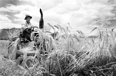 在西藏拉萨曲水县,农民正在使用收割机收割青稞。