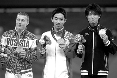 图② 8月5日,中国选手邹凯(中)、日本选手内村航平(右)和俄罗斯选手阿布尔亚申在颁奖仪式上。当日,在2012伦敦奥运会男子自由体操决赛中,中国选手邹凯成功卫冕。