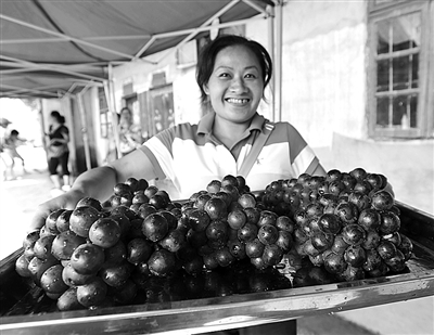 在广西兴安县溶江镇五甲村万龙山地葡萄示范基地,一名妇女端着成熟的山地葡萄送给客人品尝(8月2日摄)。近年来,广西桂林市兴安县充分利用山地资源,大力发展山地葡萄种植。万龙山地葡萄示范基地发展103亩山地葡萄种植,2011年实现销售收入70万元。