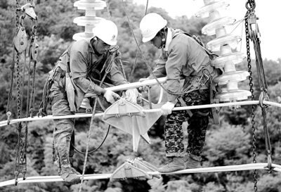 湖北省送变电工程公司施工人员在山区7号高塔上对导线进行附件安装作业。全长70公里的500千伏蒲圻电厂二期配套上网线路工程日前全线完工,可随时为即将投产的湖北蒲圻电厂二期工程输送电能。