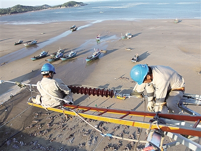 连日来,国家电网泉州电业局加紧对惠安小岞风电场110千伏送电线路工程进行架线施工。据了解,该风电场是泉州市第一座风力发电站。图为近日泉州电力员工正在铁塔上作业。 程志龙摄