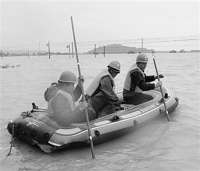 近来受台风“海葵”影响,浙江省宁海县普降大雨,由于线路遭到破坏,茶院乡糖厂片8个村庄断电。图为宁海供电局配电运检中心共产党员服务队正在驾着皮划艇进行抢修。 张跃镪摄