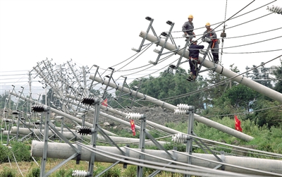 8月8日,在浙江省温岭市松门镇81省道林石线路段,供电工人加紧抢修受损电路。当日,受台风“海葵”过境影响,温岭境内34根电线杆被风刮倒,导致附近5000余家用户停电。8日一大早,温岭市供电局组织电力工人对线路进行抢修。