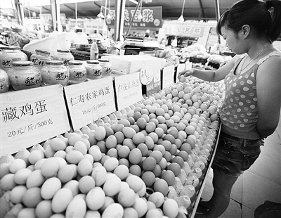 成都市一家鸡蛋摊点出售的藏鸡蛋价格高达20元每斤(8月12日摄)。据新华社全国农副产品和农资价格行情系统监测数据显示,8月11日,普通鲜鸡蛋全国日均价较7月21日价格上涨7.3%,较6月11日价格仅低0.4%。 新华社记者 李桥桥摄