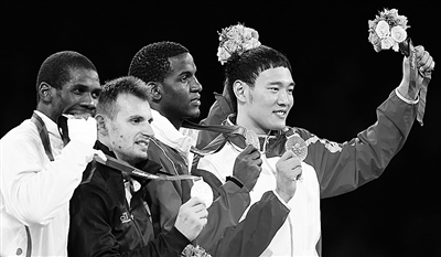 8月11日,意大利选手莫尔费塔(左二)、加蓬选手奥巴梅(左一)、中国选手刘哮波(右一)、古巴选手德斯佩涅在颁奖仪式上。当日,在伦敦奥运会跆拳道男子80公斤以上级比赛中,意大利选手莫尔费塔夺得冠军,加蓬选手奥巴梅获亚军,中国选手刘哮波和古巴选手德斯佩涅获季军。 新华社记者 王丽莉摄