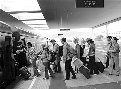 京藏车队第七组乘务员在拉萨火车站迎候旅客上车。北京铁路局北京客运段京藏车队值乘的T27/28次列车,从2006年7月1日开通以来,到今年6月30日,已安全运行1752万公里,运送旅客661万人次。