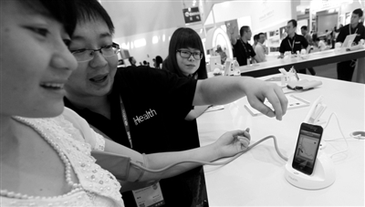 工作人员在展会上指导参观者用苹果产品测量血压。近日,为期4天的“移动互联,引领未来”2012年数字世界亚洲博览会在北京开幕,来自10多个国家和地区的500余家企业参加了这个以苹果产品为核心的全产业链展会。 罗 伟摄(新华社发)