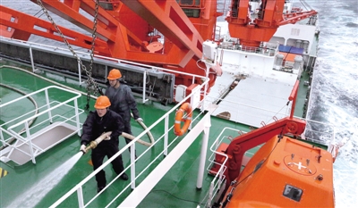 8月13日,“雪龙”号船员在做进港前的清洁工作。应冰岛总统和政府邀请,我国第五次北极科考队乘“雪龙”号极地科学考察船已于14日抵达冰岛首都雷克雅未克港附近锚地,并将于17日开始为期4天的正式访问,这也是我国北极科学考察队首次正式访问北极国家。