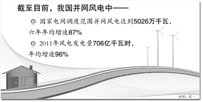 本报北京8月15日讯 记者李予阳报道:记者今天从国家电网促进风电等新能源发展新闻发布会上获悉,截至目前,我国并网风电达到5258万千瓦。其中,国家电网调度范围并网风电达到5026万千瓦,六年年均增速87%;2011年风电发电量706亿千瓦时,年均增速96%。我国已取代美国成为世界第一风电大国,国家电网成为全球风电规模最大、发展最快的电网,大电网运行大风电的能力处于世界领先水平。