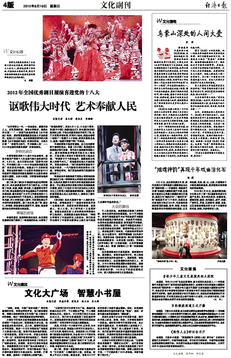 为贯彻落实党的十七届六中全会精神,喜迎中国共产党第十八次全国代表大会的胜利召开,8月9日,由文化部主办的“讴歌伟大时代,艺术奉献人民——2012年全国优秀剧目展演”在北京拉开帷幕。在随后3个月的时间里,来自全国各地的119台剧目(包括参加2012年国家艺术院团优秀剧目展演的35台剧目)将在国家大剧院、长安大戏院、天桥剧场等场地演出240余场。