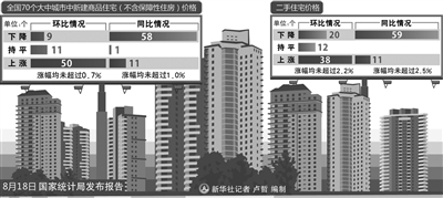 从新建商品住宅价格同比变动看,7月份全国70个大中城市中,价格下降的城市有58个,比6月份增加了1个,持平的城市有1个,上涨的城市有11个,与6月份持平。7月份,同比价格上涨的城市中,涨幅均未超过1.0%,涨幅比6月份回落的城市有5个。