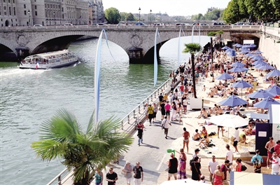 图① 8月18日,市民在法国巴黎塞纳河畔的人工沙滩上消暑。