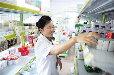 浙江诸暨镇医院医护人员正在给患者取药品。目前,我国基层医疗卫生机构实行基本药物零差率销售,比上一轮采购价平均下降30%。群众用药负担下降,得到更多实惠。