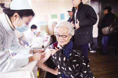 北京一家社区卫生服务站,60岁以上老人在免费接种甲流疫苗。