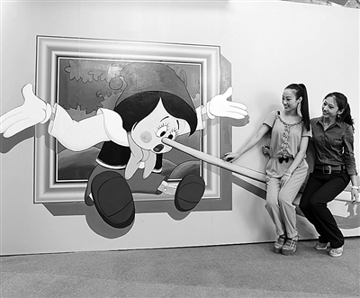8月18日,在惊天幻视3D艺术展上,参观者与展出作品《匹诺曹》互动。近日,惊天幻视3D艺术展在北京798艺术区举行。立体画展最大特点是参与性和互动性,每位观众在参观过程中,都会有身在画中的感觉。展览将持续到9月9日。 罗 伟摄(新华社发)
