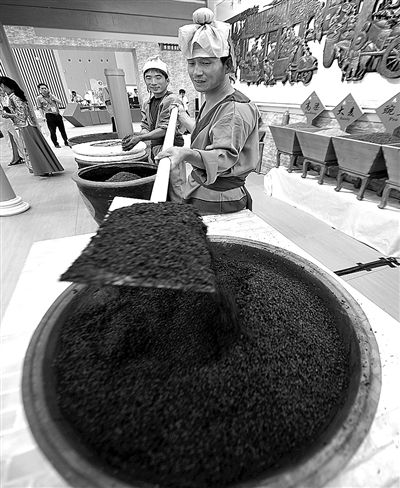 8月20日,工作人员在醋文化节上展示清徐老陈醋酿制技艺。当日,中国太原(清徐)国际醋文化节在太原煤炭交易中心开幕。此次文化节由醋文化展示、醋与健康论坛、醋形象及品牌传播等板块组成,旨在展示清徐悠久的老陈醋酿造历史,弘扬醋文化、汇集醋商机、发展醋经济。 新华社记者 詹 彦摄