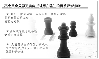 随着上市公司2012年半年报相继披露,不少基金公司下半年“排兵布阵”的思路也逐渐清晰。从目前基金公司发布的投资策略报告可以看出,除了青睐蓝筹股外,基金公司还把目光投向了“金融制度改革”等主题带来的投资机会。